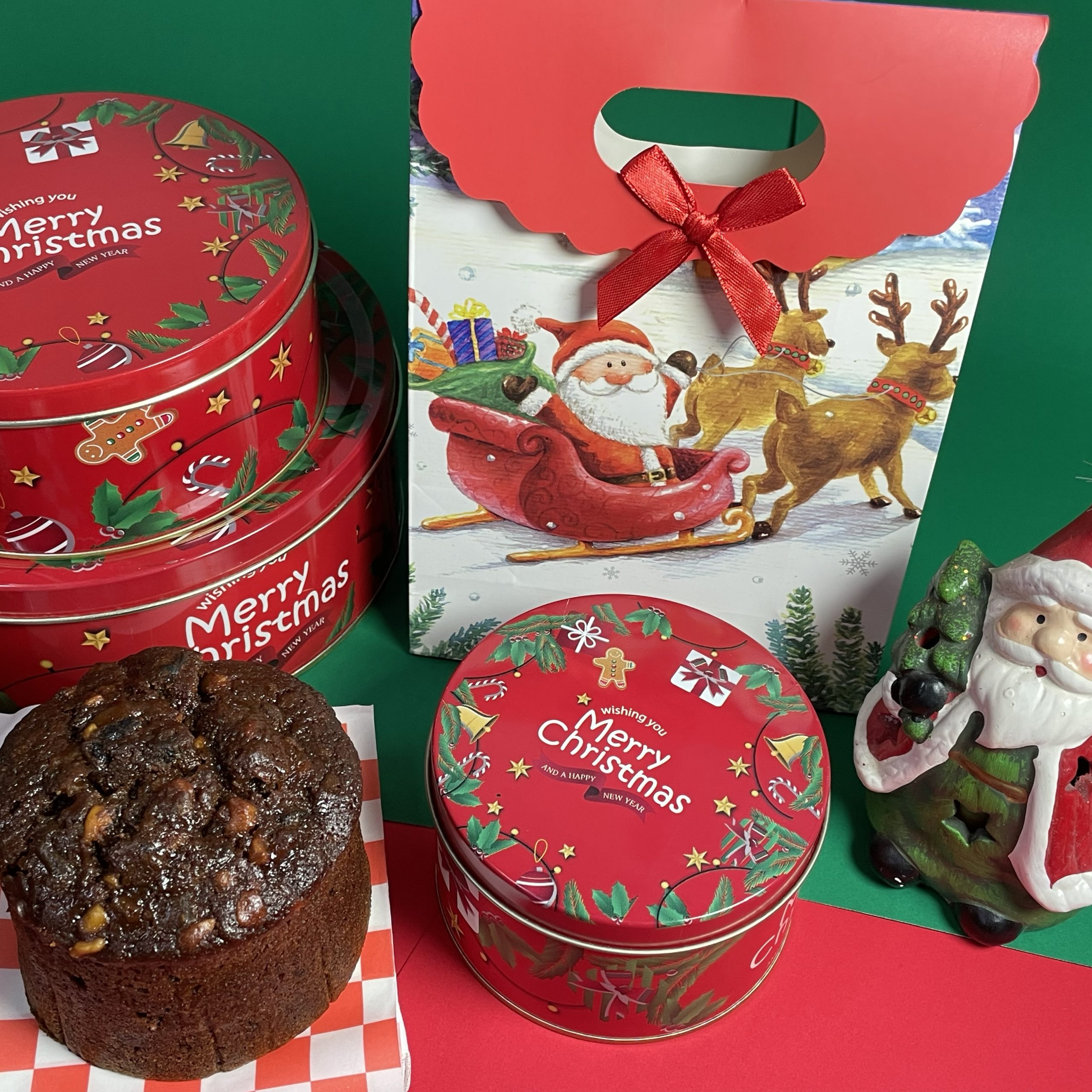 A gift box with an assortment of Christmas goodies- Our quintessential Christmas Plum Cake Star ( 150 gms), Jar of Mini Christmas Macarons & Jar of Chocolate Truffles.